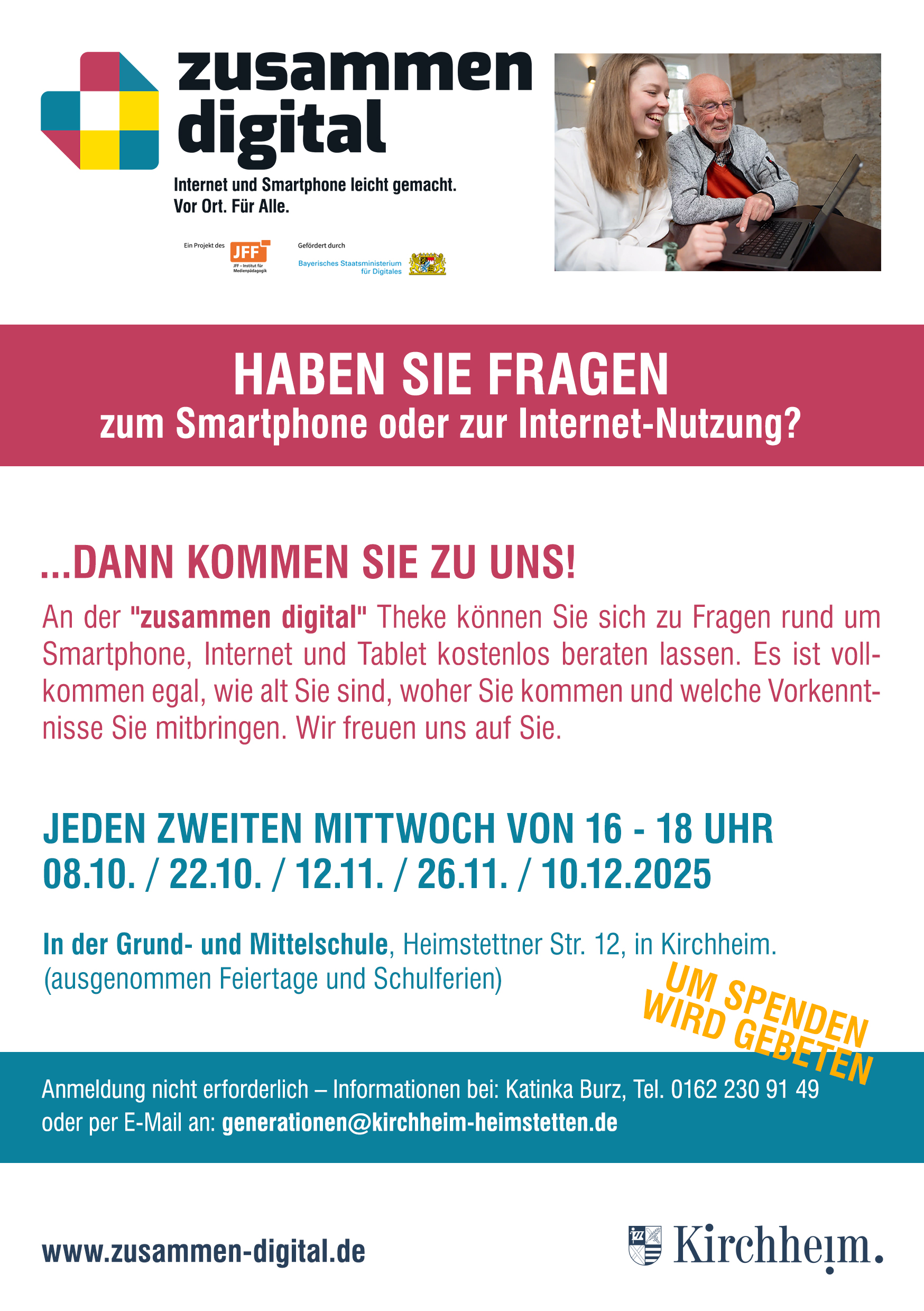 Die Gemeinde Kirchheim möchte mit zusammen digital ein nieder­schwel­liges und genera­ti­ons­über­grei­fendes Angebot  instal­lieren. Unser beson­deres Interesse dabei ist, Jung und Alt zusammen zu bringen, gegen­sei­tiges Vonein­an­der­lernen, Verständnis zu ermög­lichen und zu fördern. Jugend­liche werden an ein Ehrenamt heran­ge­führt, und können dadurch Selbst­wirk­samkeit erleben.
